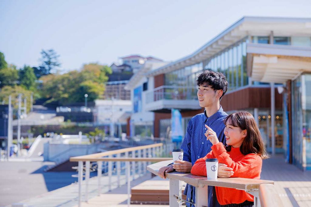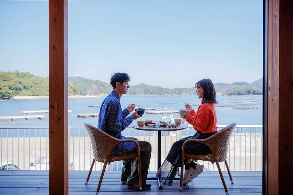 『迎 ムカエル』。海側に設けられたデッキや展望ラウンジからは気仙沼湾が一望できます