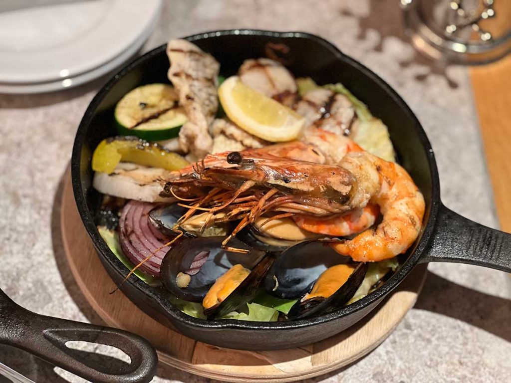 見た目も華やかな「大海老と本日の魚介のグリル」。エビや貝類のほか、野菜もたっぷり!