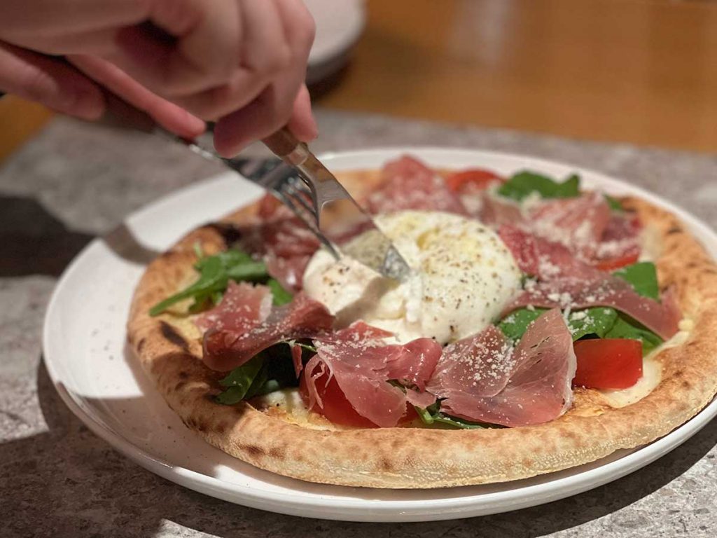 「生ハムとブラータチーズ」のピッツァ。チーズをカットする瞬間のワクワク感たるや。