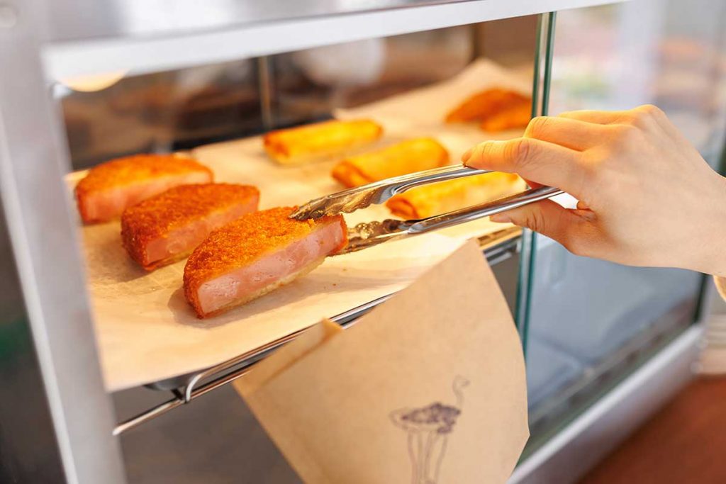 カウンター横には「ホットスナックコーナー」があり、「厚切り半月ハムカツ」(300円)や「フライドポテト」(400円)などはセルフでとるスタイル。これもまた、ライブ感があって楽しいですね。