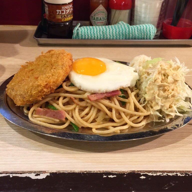 昔懐かしい洋食のナポリタンや食べごたえ満点の肉料理を味わえる『俺たちのナポリタン』。今回の対象メニューは、パスタをかつおだしで調味し、バターで炒めた「和ポリタン」です。こちらはMサイズ(300g)かLサイズ(400g)のいずれを選んでもOK。私はちょっとヒヨッてMサイズをオーダー(笑)。サクサクでジューシーなメンチカツと、ポテトサラダと目玉焼きまでついて1コインです。ボリューミィなビジュアルと、「昭和の洋食屋」を彷彿とさせるステンレス皿で提供されるので、写真映えも◎。腹ペコさんにおすすめしたい一軒です。
