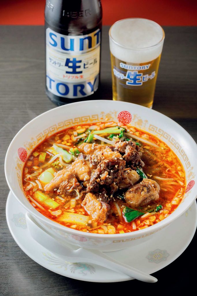 「広東牛肉麺」(990円)は一度食べればクセになる、深みのある辛みが魅力。辛い麺にはビールがぴったり!米派は「広東牛肉飯」(990円)もぜひ
