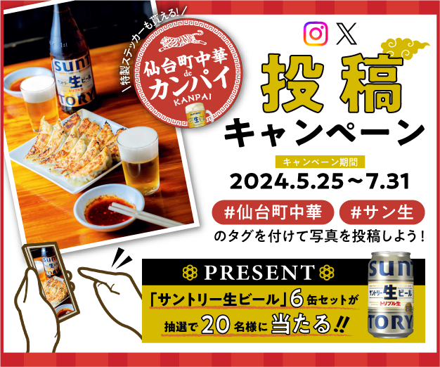 掲載店舗のいずれかで、料理&サン生の写真を撮って【#仙台町中華 #サン生】のハッシュタグを付けて、Instagram・Xで投稿してくれた人の中から抽選で20名様に「サントリ―生6缶セット」をプレゼント!