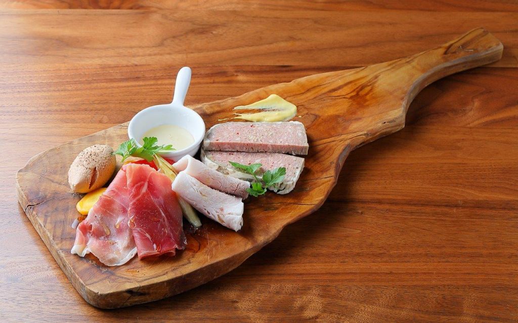 「お肉の自家製惣菜盛り合わせ」は鶏白レバーのムース、パテドカンパーニュ、ボイルハム、生ハムが楽しめる贅沢なひと皿