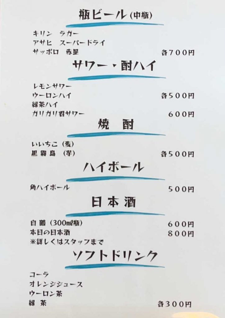 ドリンクメニュー。昼もお酒の注文可能。ふらりと昼飲みにもいいですね!