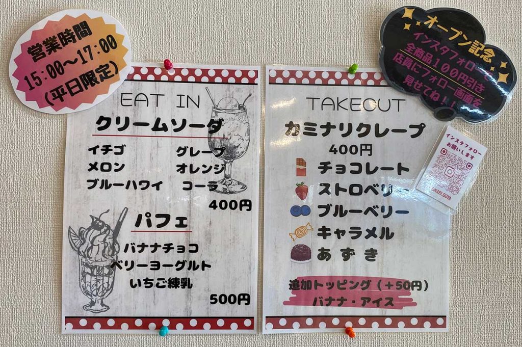 『おやつ屋 雷坊』のメニュー表※平日15:00~17:00限定