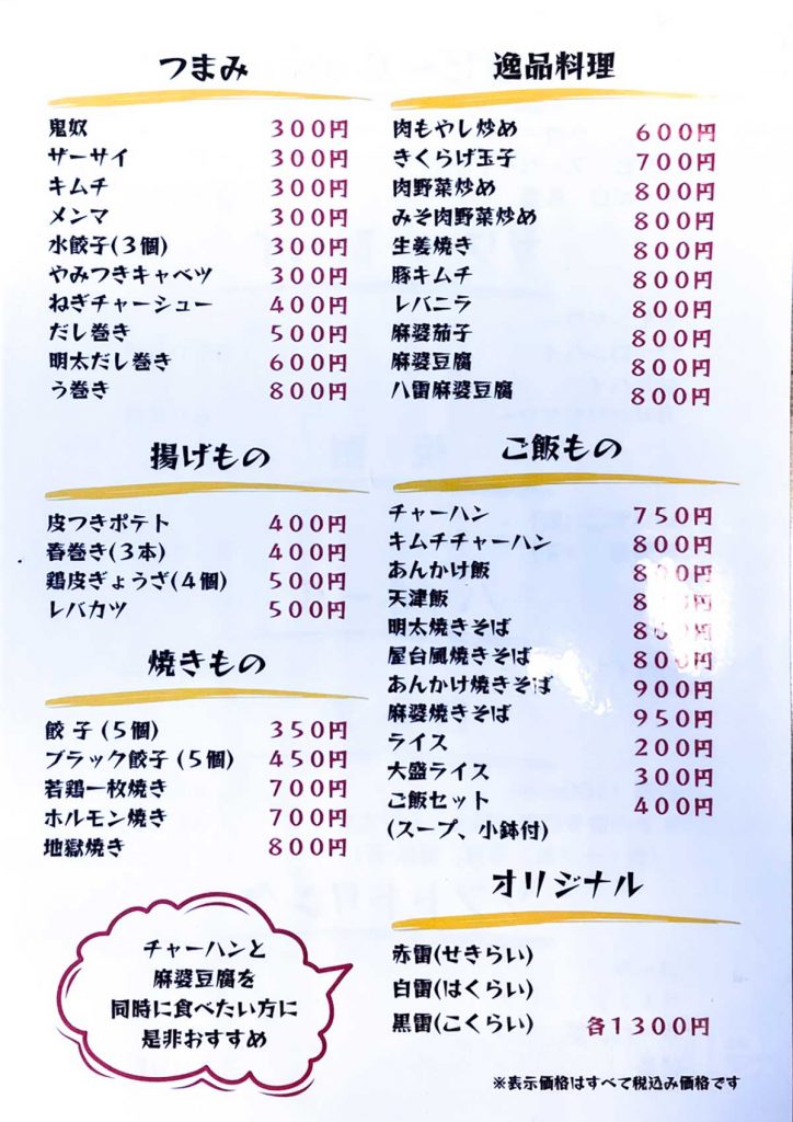 炒飯と麻婆豆腐を組み合わせた「黒雷」などのオリジナルメニューをはじめとした、中華料理を多数ラインナップ。