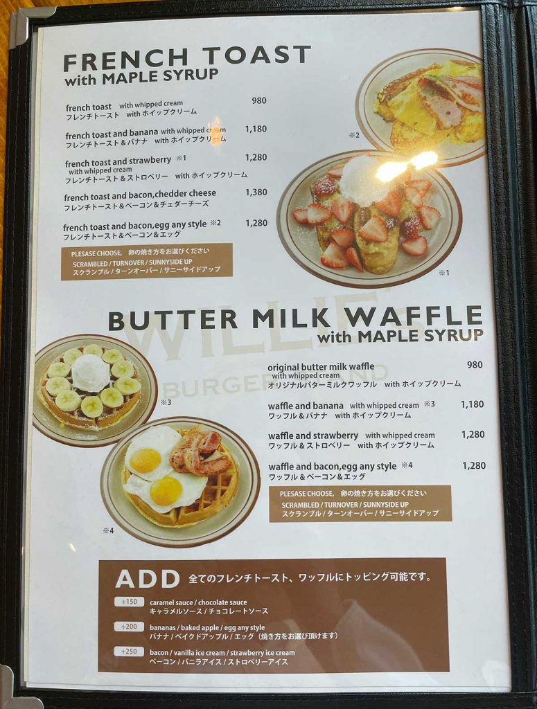 フレンチトースト、バターミルクワッフルのメニュー表