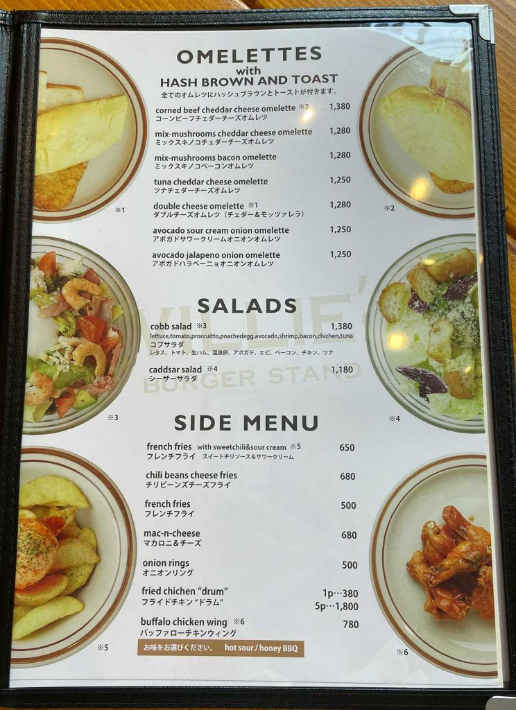 オムレツ、サラダ、サイドメニューのメニュー表