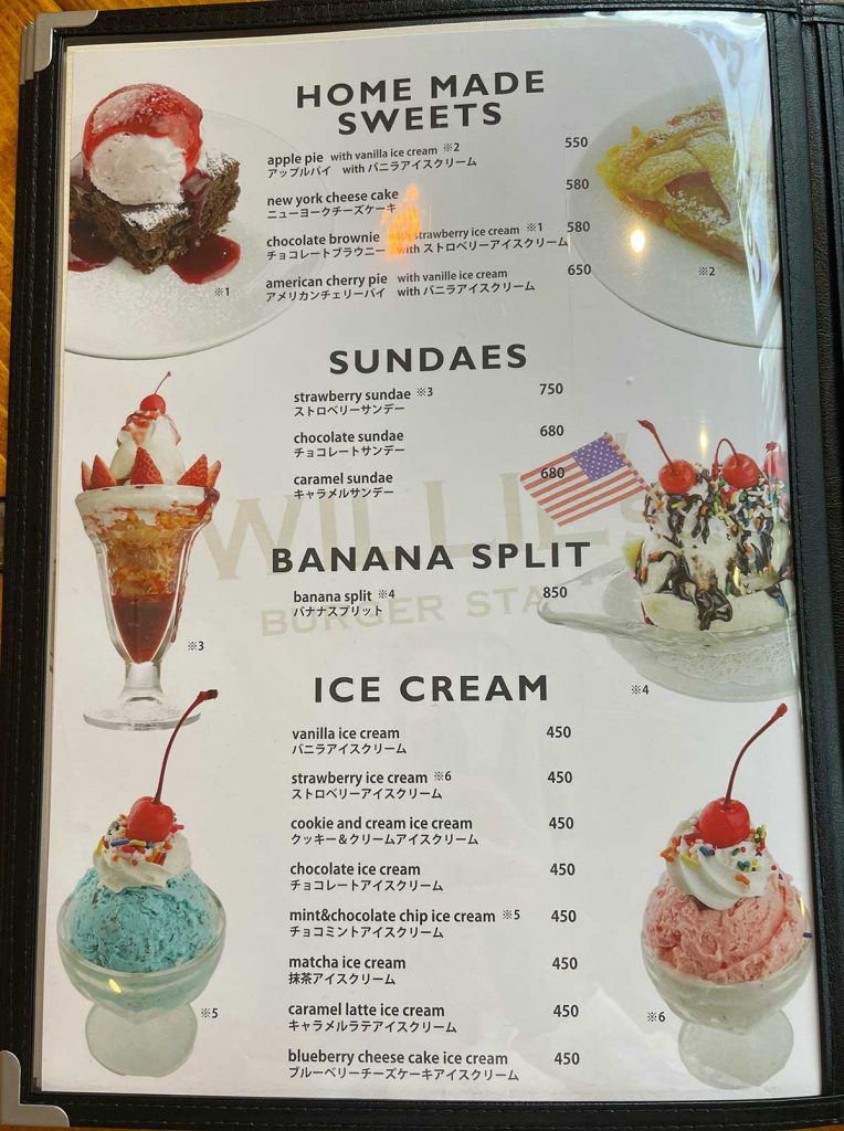 ホームメイドスイーツ、サンデー、バナナスプリット、アイスクリームのメニュー表