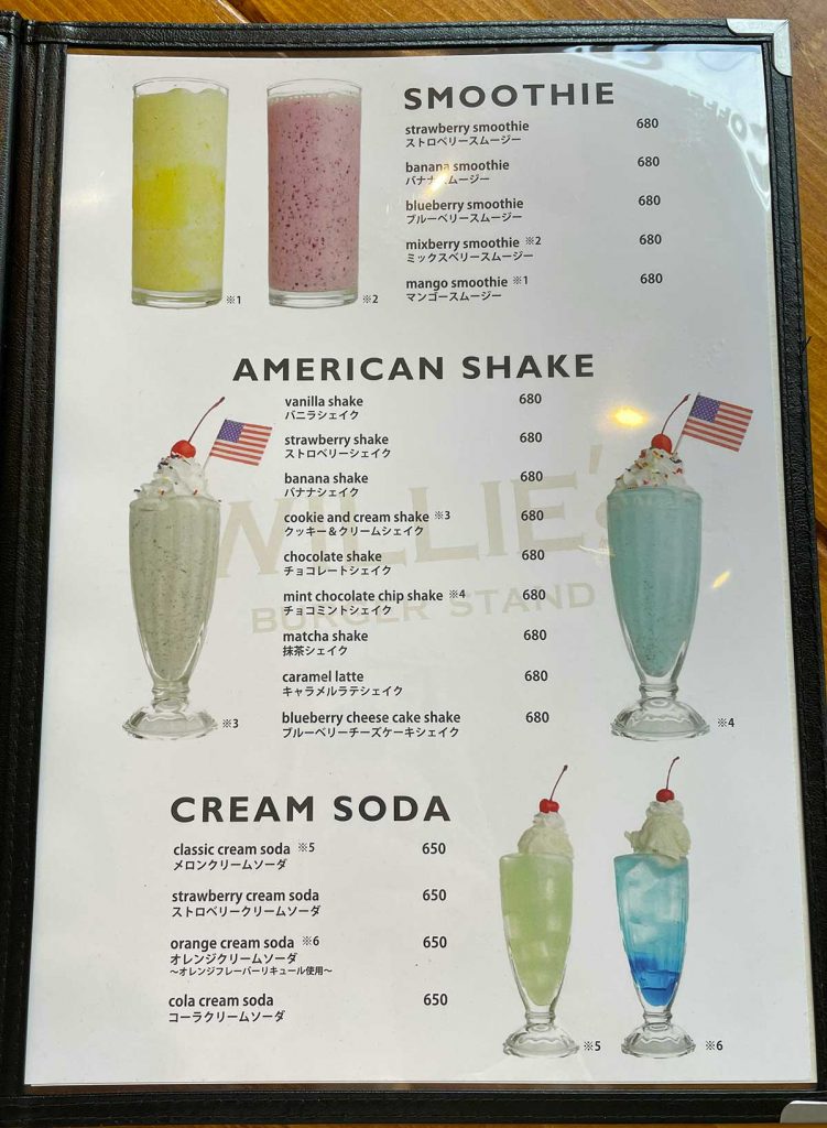 スムージー、シェイク、クリームソーダのメニュー表