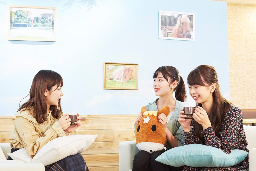UMAJOとは、大好きな可愛いウマに会って、ふれて、応援して、ケイバを楽しむ女性たちのこと。UMAJO SPOTは、そんなUMAJOのためのリラックススペースです。※女性のお客様専用のスペースです。