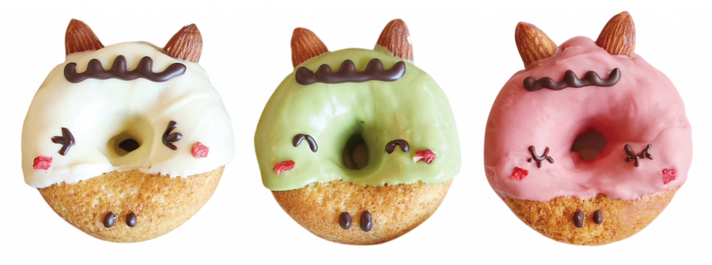 『シフォンとベイク Coton.』「まんまる!サラブレッドーナツ」(ホワイトチョコ¥500、宇治抹茶¥500、ストロベリー¥500)