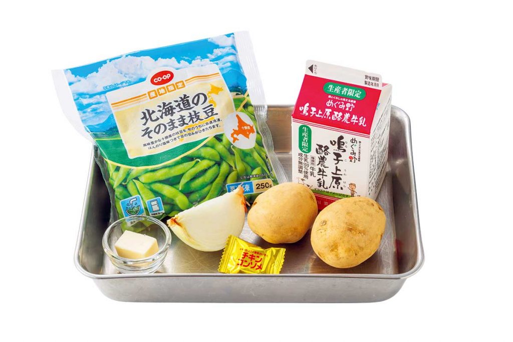 <下ごしらえ>じゃがいもは3cmの角切り、玉ねぎはみじん切りにする。コンソメは熱湯で溶かしておく。冷凍の枝豆は解凍し、さやから取り出す。