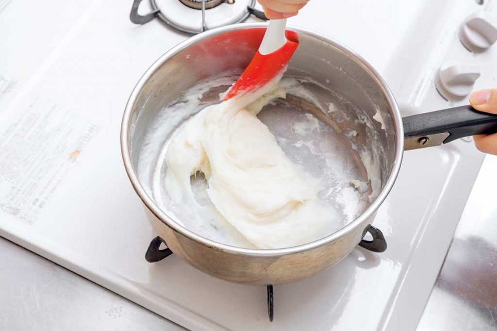 ❶フライパン(鍋)を中火にかけて絶えずかき混ぜ、とろみがついてきたら弱火にし、2分程しっかりと練り上げ1つにまとめる。(※)