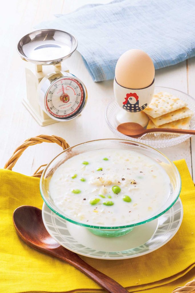 ❷じゃがいも・玉ねぎに火が通ったらバターを加え、マッシャーかフォークの背でじゃがいもを潰し(※)、溶かしたコンソメ・冷たい牛乳・枝豆を加えて混ぜ合わせ、塩・こしょうで味を調え、冷蔵庫で冷やしたらでき上がり。