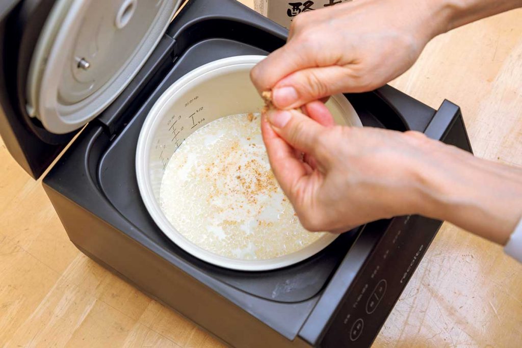 ❶炊飯器に米とコンソメを入れ(※)、1合炊きの目盛りまで牛乳を加えてよく混ぜる。