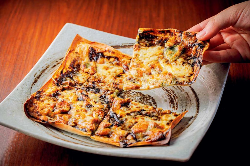 湯葉を焼いて仕上げた新感覚の「湯葉とよもぎ麩のパリパリピザ風」(750円)も店の名物です