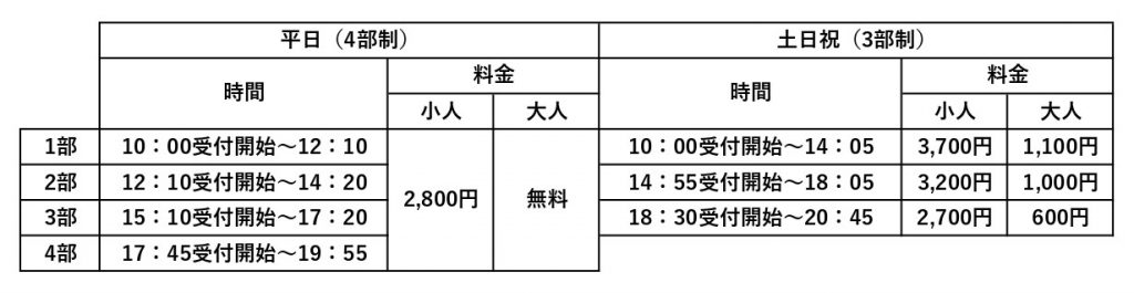 ※学校の休暇期間、長期連休の際は「土日祝日料金」とする場合があります