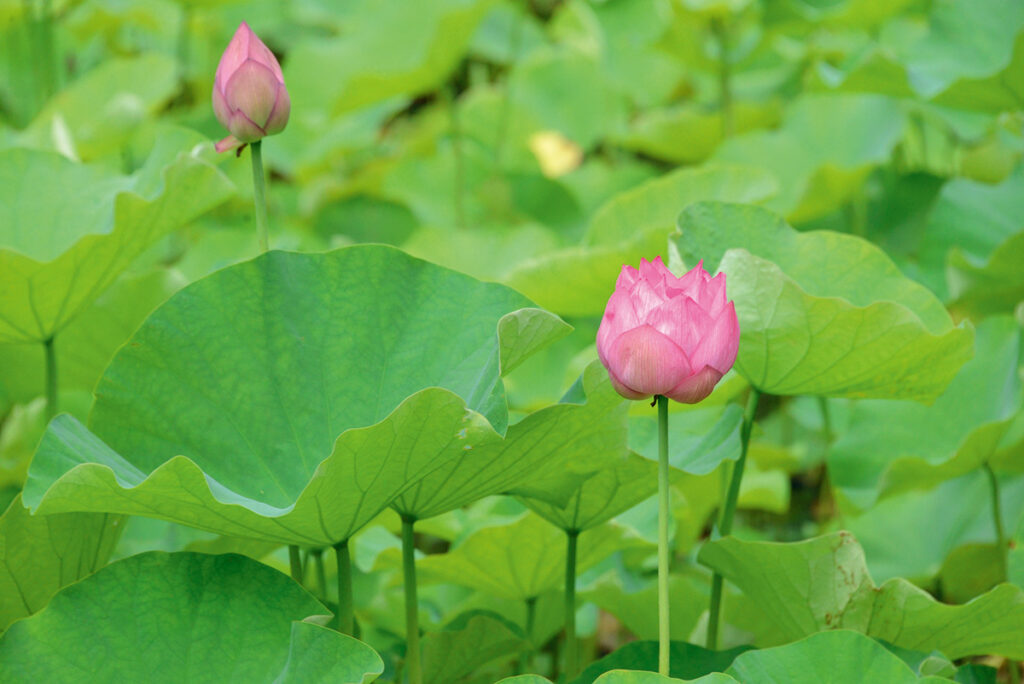 アヤメや大賀ハス、スイレン、ハナショウブ、ミズバショウなど、季節ごとにさまざまな湿生植物が咲き誇る「四季彩苑」(大衡村)