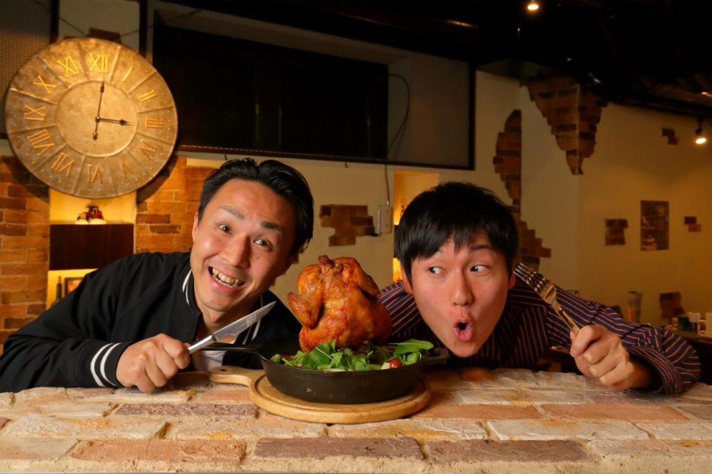 二人の目の前に運ばれたのは、鶏の丸焼き「テキサスビア缶チキン」。これまた食欲をそそる! 目の前に並ぶ料理の数々を、心行くまで堪能した二人なのでした。
