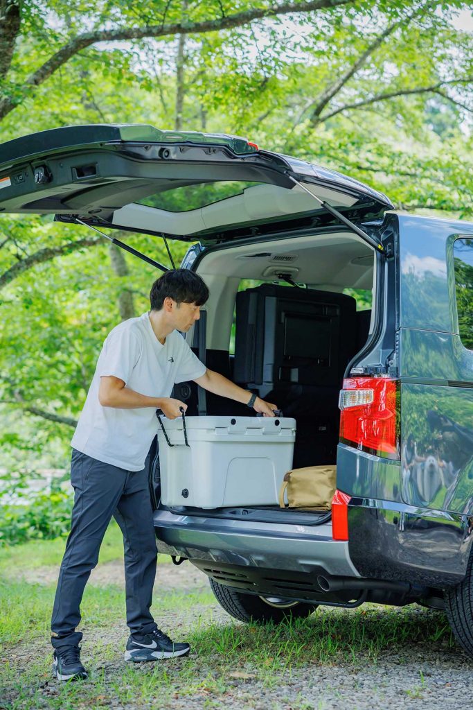 4人家族に加えて愛犬のゲージを入れても余裕のある、広い車内空間。アウトドア遊びで疲れたら、車内でのびのびと休憩ができるのも魅力のひとつ。