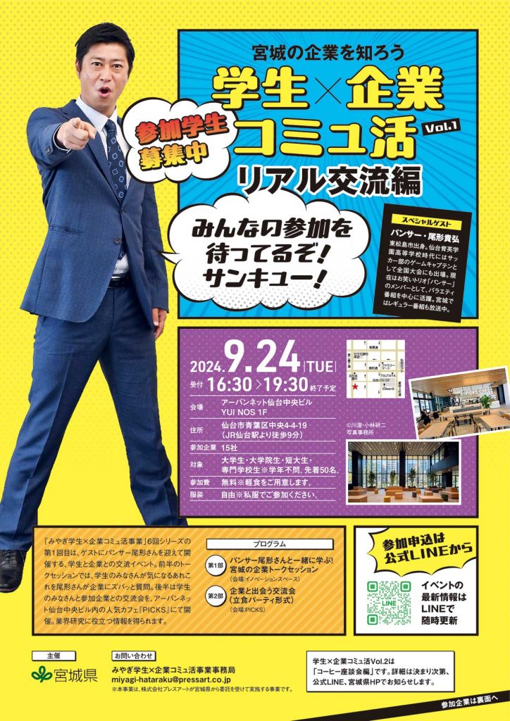 宮城県内での就職に興味がある学生を対象に、宮城県内の企業と楽しく交流できる就活準備イベント「学生×企業コミュ活Vol.1~リアル交流編~」が開催されます。イベントに参加して、県内の企業の魅力に触れてみよう!
