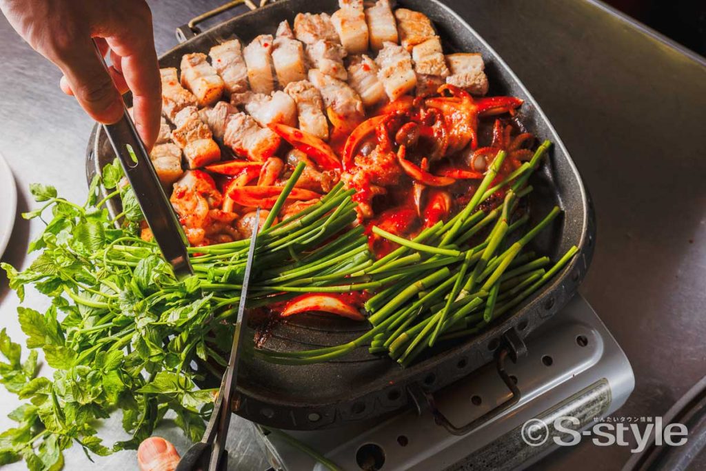 鉄板に残ったサムギョプサル、チュクミ、セリを細かくカットし、ポックンパの具材と混ぜ合わせていきます!