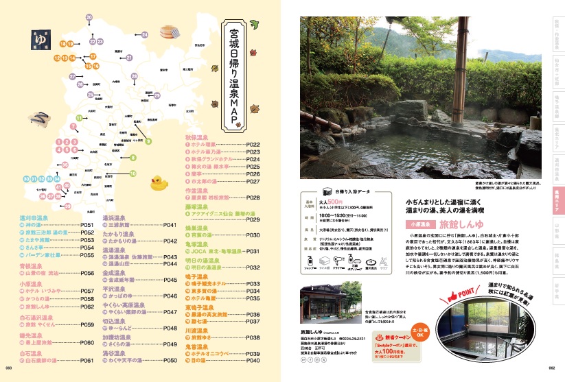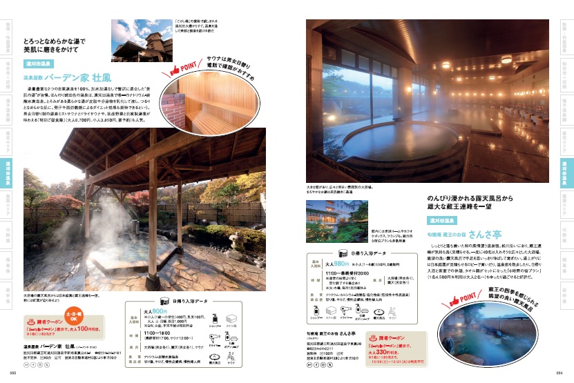 宮城県内の人気温泉地はもちろん、今年は山形・福島・岩手の温泉施設を合わせた全52軒を紹介!