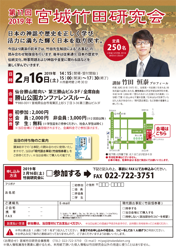11回を迎えるこのイベント、今回より講演の前半では竹田先生解説による「古事記」の読み合わせ勉強会を行います。後半は従来通り、日本の歴史や伝統文化、時事問題および神話や皇室に関わる話などを楽しく学んでいきます。