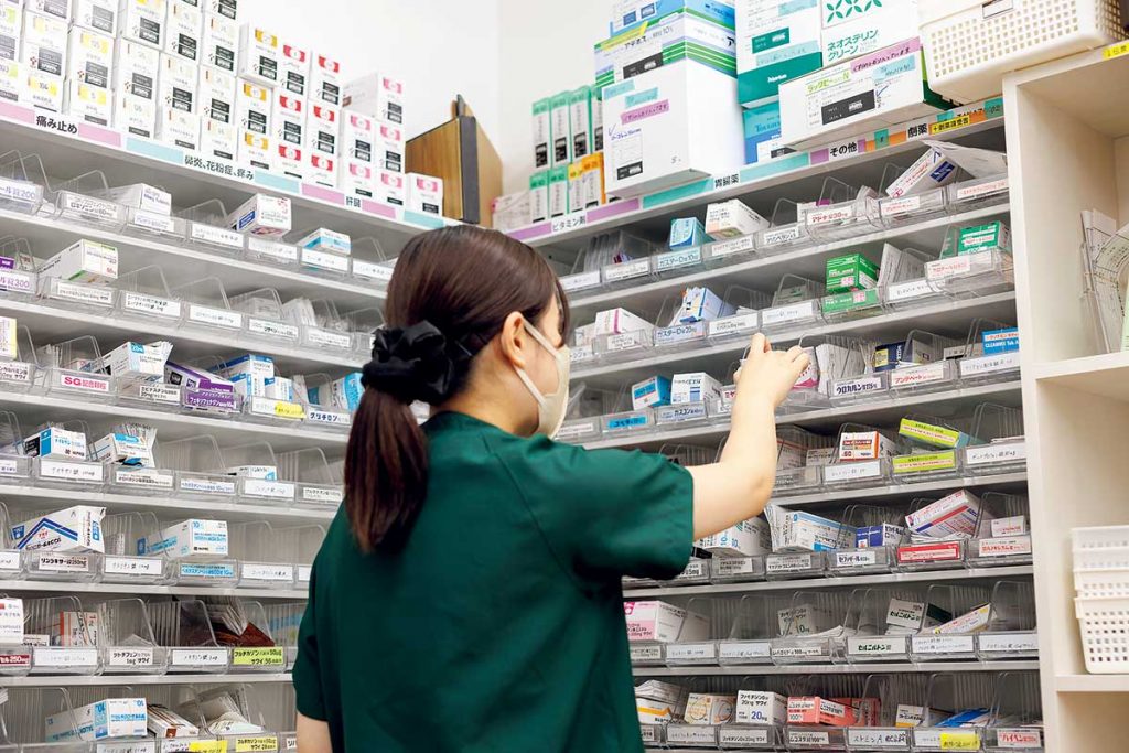 『カミツレ薬局』で専門的に販売するのは、処方箋なしで購入できる医療用医薬品。2万種類ある医療用医薬品のうち、半数の取り扱いが可能です。処方する際はよく話を聞いたうえで対面販売するので安心!