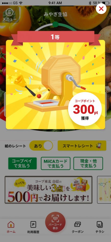 1等300コープポイント、2等100コープポイント、3等10コープポイントのいずれかが必ず当たります。当たったポイントは、即日付与されます
