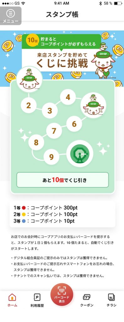 「コープアプリ来店スタンプ」は、会計の際に「コープアプリ」の「お支払いバーコード」を提示してスタンプを貯め、10個貯まる度に抽選で