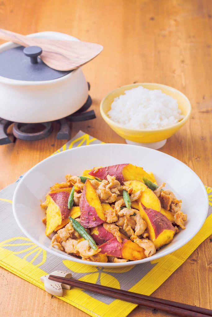 ❷フライパンに油を熱し、肉を炒め、色が変わったらさつまいもと合わせておいたAを加え混ぜ、全体に照りが出たらでき上がり。