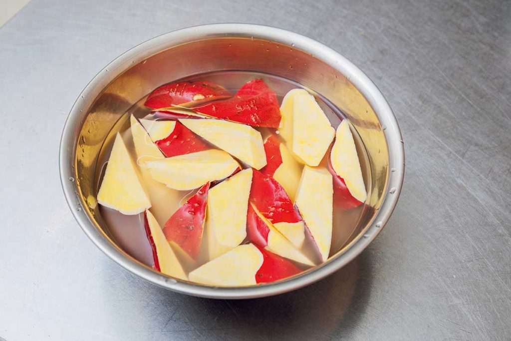 <下ごしらえ>さつまいもはよく洗って皮ごと細身の乱切りにし、10分程度水にさらしてアクを取り(※)ザルに上げる。いんげんは解凍して半分に切る。