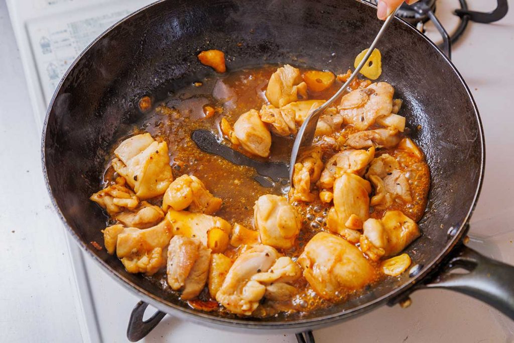 ❷フライパンにオリーブオイルを熱して薄切りにしたにんにくを入れたら、皮面から鶏肉を入れる。鶏肉全体に焼き色が付いたら火を弱めて、合わせておいたAを加え炒める。