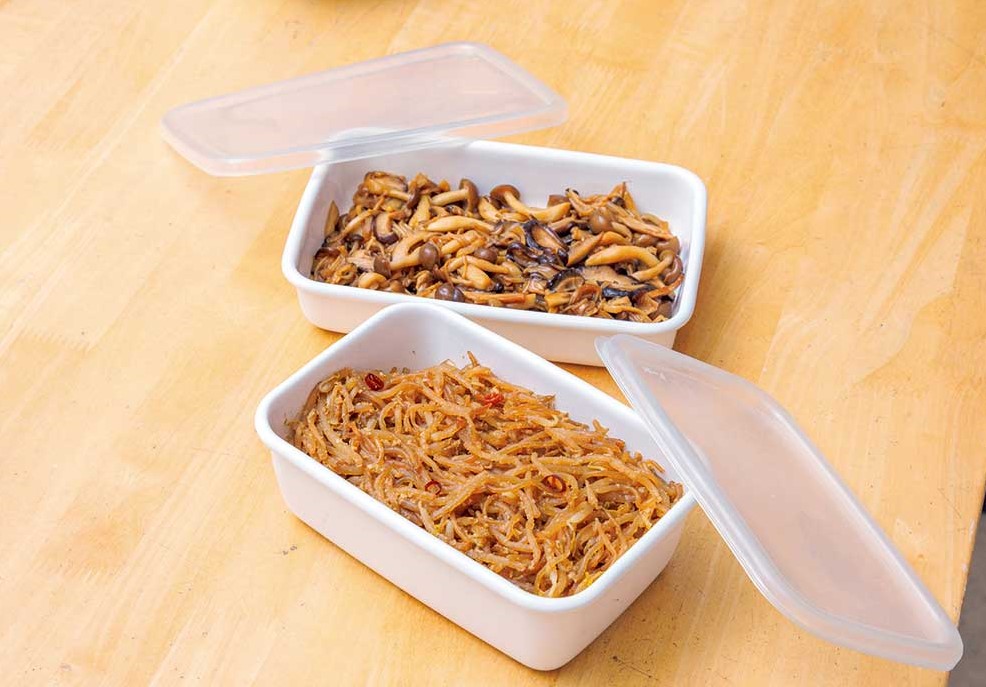 <下ごしらえ>えのきは石づきを取って半分に切り、しめじはほぐし、しいたけは薄切りにする。