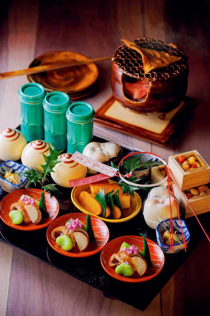 自家製のカラスミやイワシの香梅煮、イイダコと山菜のジュレかけなどを盛り込んだ如月の八寸です