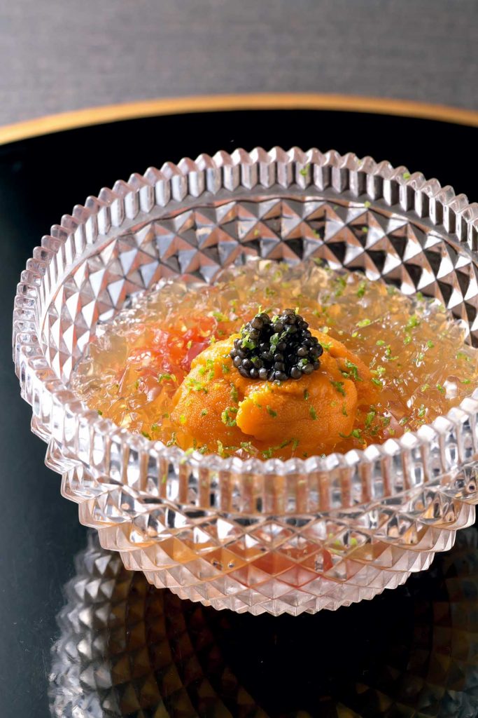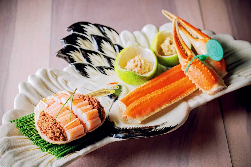 「蟹コース」(1万8,000円)は11月~ 12月限定。北陸・山陰の松葉ガニを使用し、メスは濃厚な味わいの内子とプチプチとした食感の外子を楽しめます