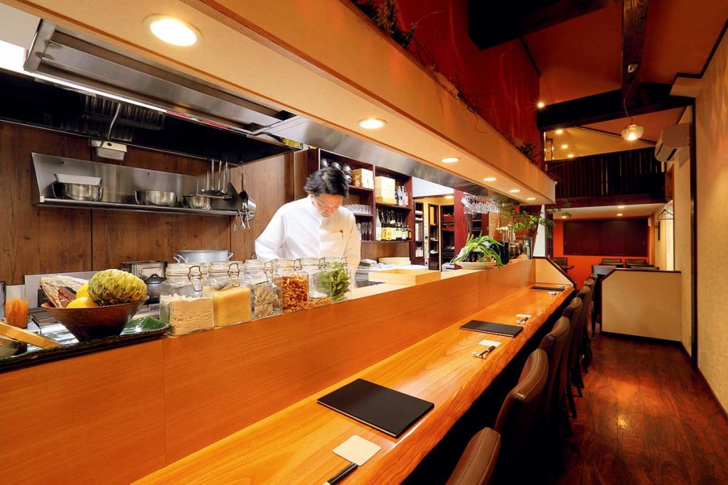 一枚板のカウンターが設えられた店内。最大で10名ほどで使えるテーブル席もあります