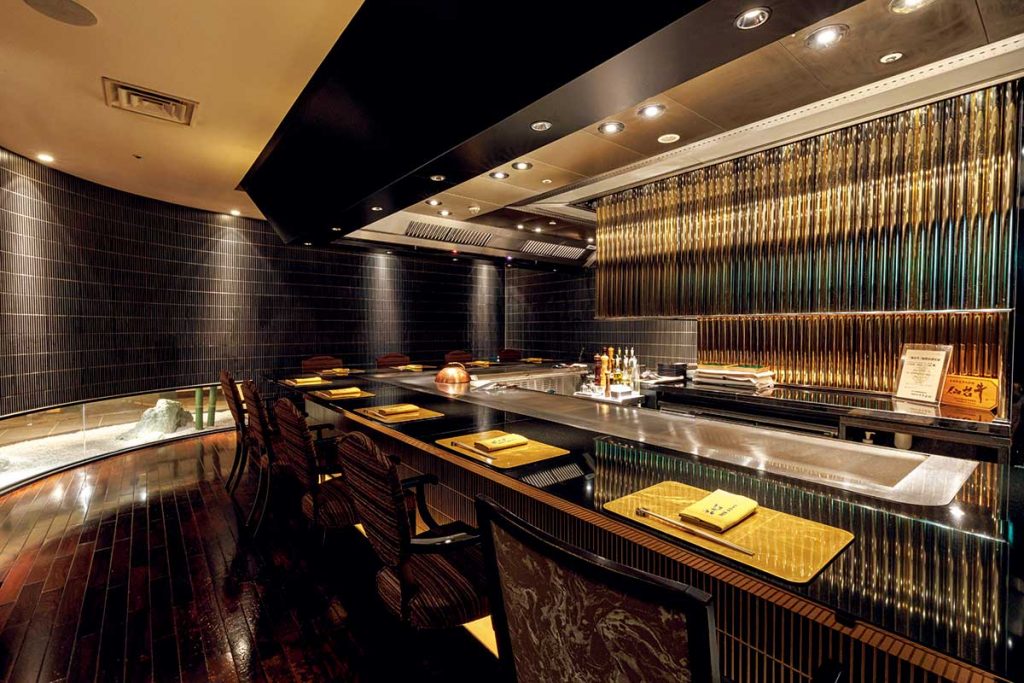 洗練された趣の鉄板焼カウンターです。目の前で豪快に焼き上げるパフォーマンスも楽しめます