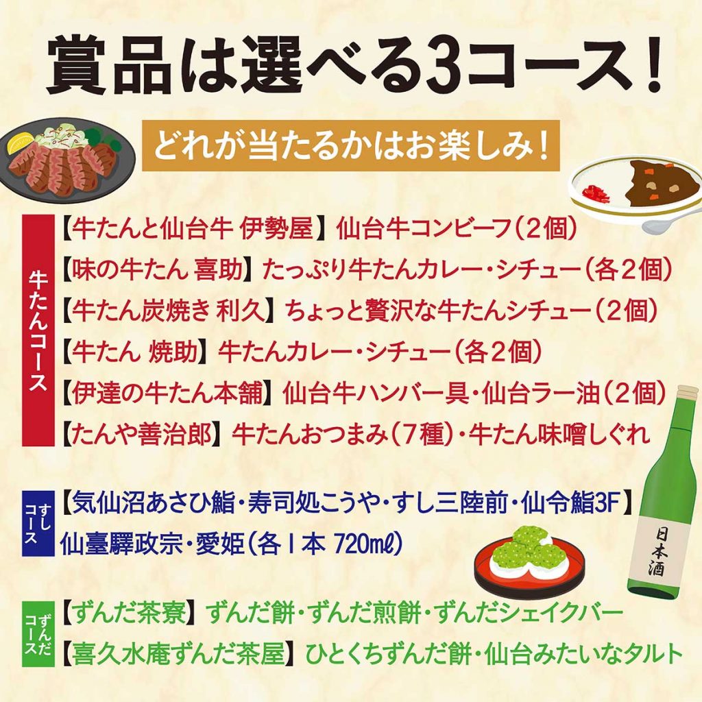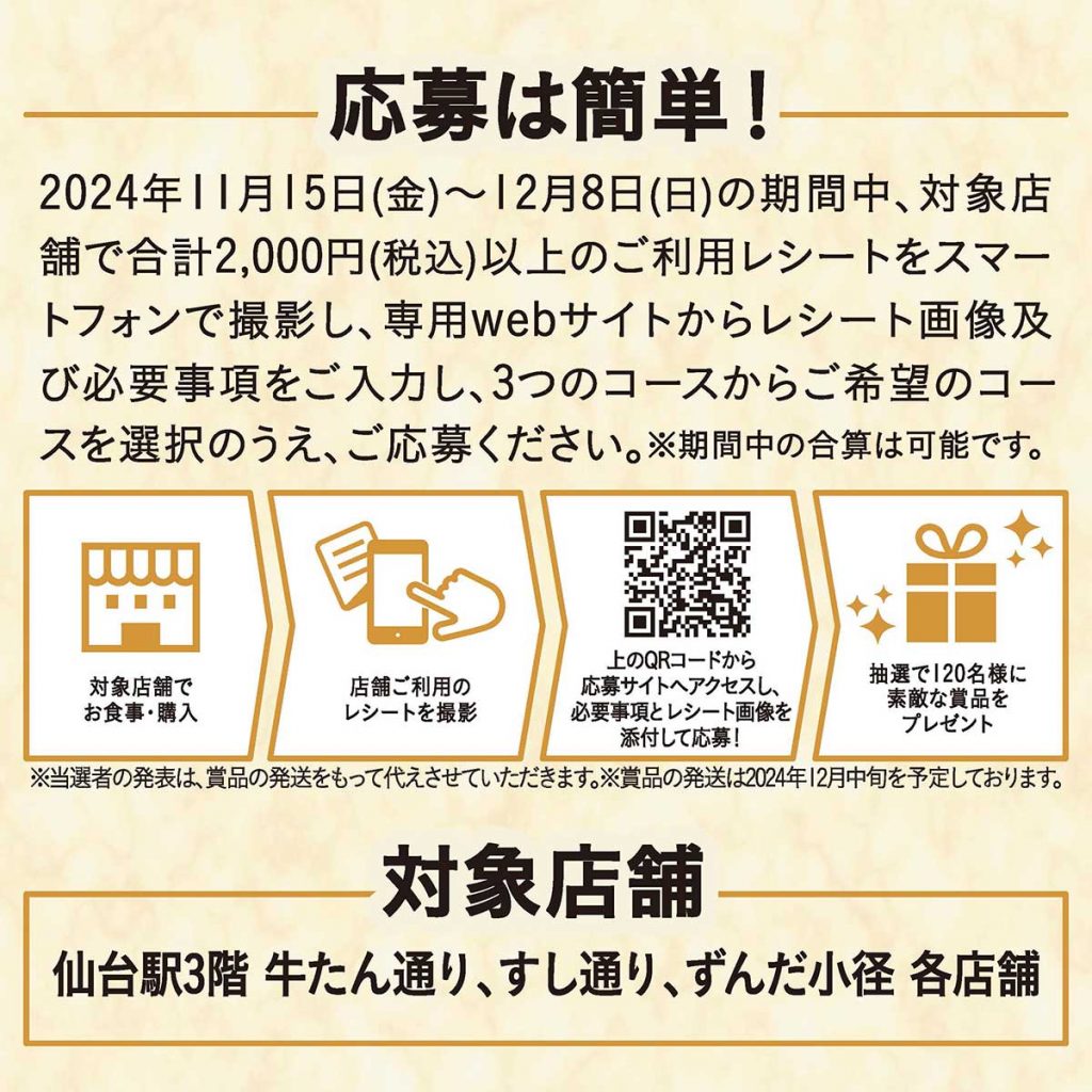 2024年12月8日(日)まで、対象店舗で2,000円以上食事をして応募すると、「牛たんカレー」や「日本酒」、「ずんだスイーツ」など、宮城グルメが抽選で120名様に当たる太っ腹な内容。