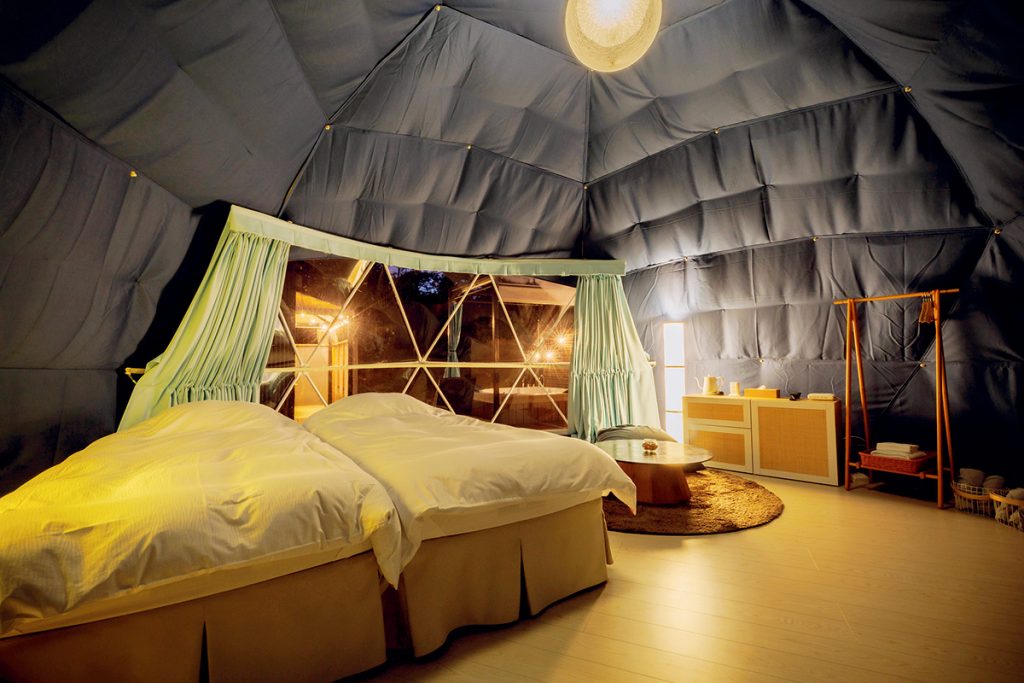 ドーム型テントの中は、まるで高級ホテルのような上質な空間が広がる。エアコンも付いているのでテント内にいれば真冬でも快適に過ごせる