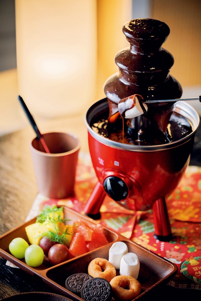 冬限定プランにはチョコファウンテンのサービス付き。マシュマロや果物にたっぷりディップしてスイートなひと時を味わおう