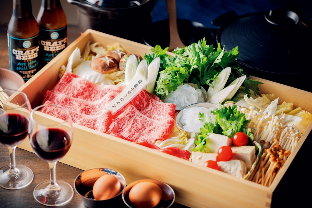 寿司職人であるオーナーが厳選した食材を楽しめるディナーは至福の時間。冬は国産牛と地場野菜が主役の絶品すき焼きを用意。暖かいテントの中で贅沢な食の時間を満喫しよう