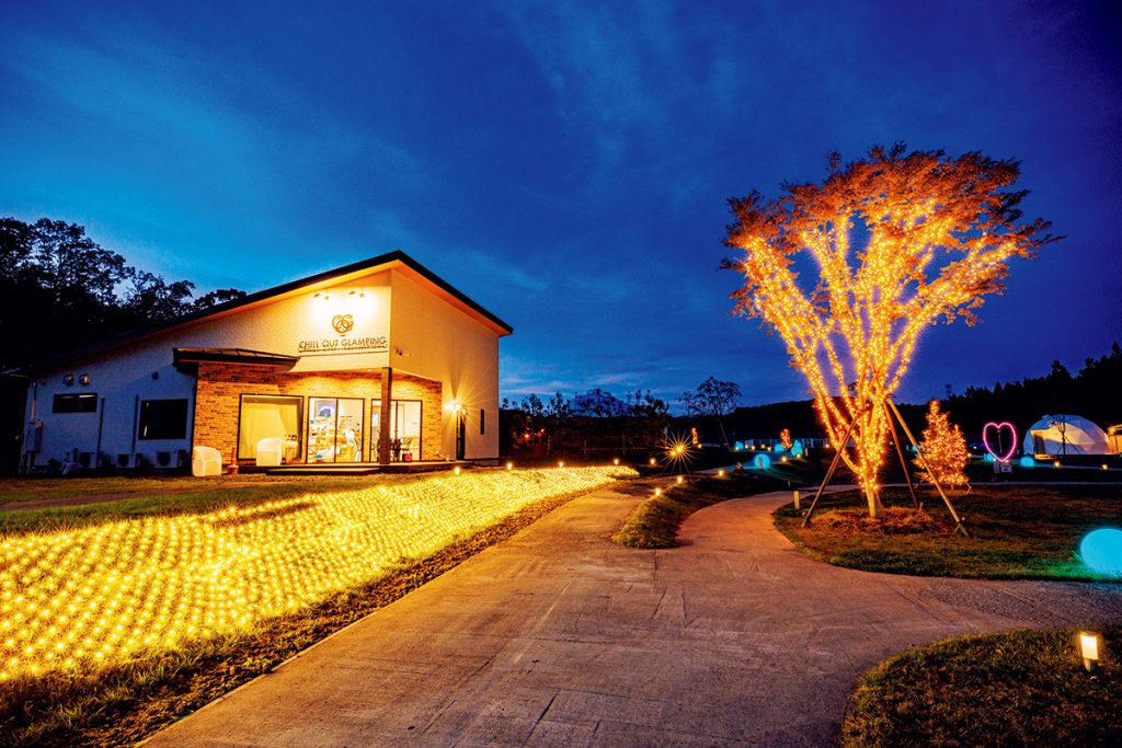 イルミネーションに焚火と、冬ならではのロマンティックな気分が楽しめる『チルアウトグランピング蔵王』。