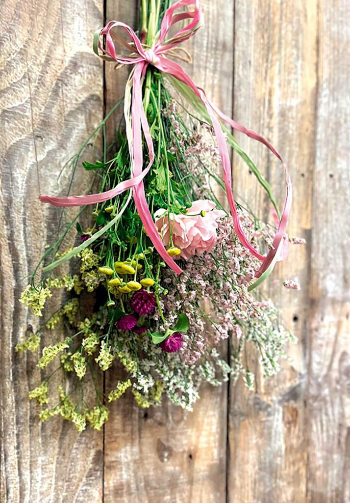 季節の花を使った壁かけスワッグを作るレッスン。飾っているうちに、徐々にドライフラワーに変化していく様子も楽しめます。講師はフローリストクラウンの坂田綾華さんです。