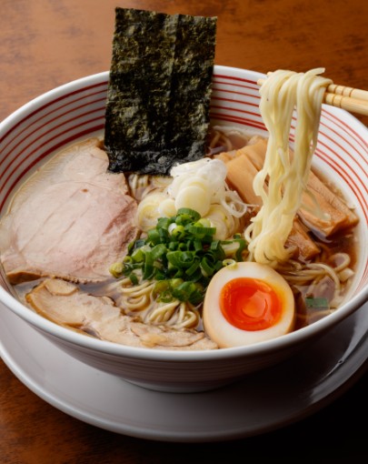 鴨ガラ、鶏ガラ、豚ガラ、魚介ダシがベースのパンチある特製スープに煮干やカツオ節の香りを移した香味油を加え、旨みを何層にも重ねた一杯に仕上げた。野田鴨のガラの旨みと甘みが溶け込んだ、香り豊かでキリッとした味わいのスープはしっかりとコクが感じられ最後の一滴まで飲み干したくなる味わいだ。宮城県産小麦粉「ゆきちから」と北海道産小麦「ホクシン」をブレンドした、のど越しの良いストレート細麺と共に楽しもう。