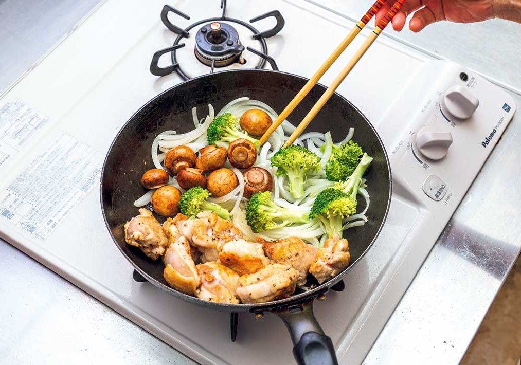 ❷フライパンにオリーブ油を入れ、鶏肉を皮面から入れてよく焼き、両面に焼き色がついたら端によせ、①を加えて焦がさないように炒める(※)。