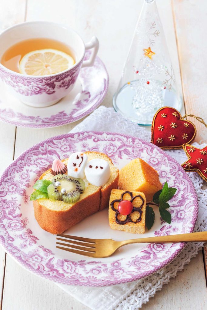 ❶ロールケーキは寝かせて皿にのせ、その上にマシュマロや型抜きした果物等を盛り付ける。
